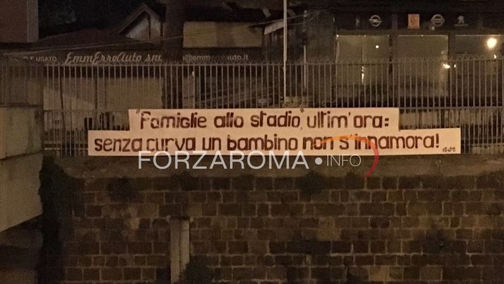 Non si ferma la protesta dei tifosi giallorossi contro le barriere presenti all'interno delle due curve dello stadio Olimpico. Nella notte, infatti, alcuni ultras della Roma hanno esposto uno striscione sull'Olimpica per rivolgersi alle istituzioni che invocano il ritorno allo stadio delle famiglie e dei bambini. Questo il testo dello striscione: "Famiglie allo stadio, ultim'ora: senza curva un bambino non s'innamora!".