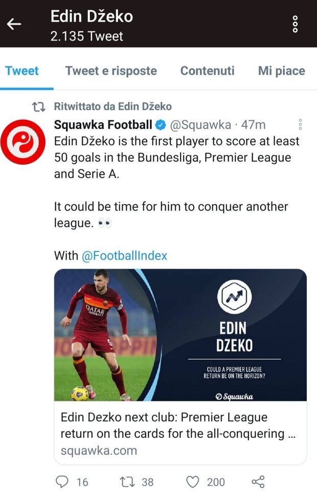 Una semplice statistica che si trasforma in un indizio di mercato. Talvolta succede, oggi è capitato a Edin Dzeko, che ha ritwittato il post pubblicato dal sito Squawka.com. "Dzeko è il primo calciatore ad aver segnato 50 gol in Bundesliga, Premier League e Serie A", un bilancio già sottolineato in passato che tuttavia precede una frase molto interessante in chiave calciomercato: "Per lui potrebbe essere arrivato il momento di conquistare un altro campionato". Difficile che il bosniaco, o chi si occupa del suo profilo, non si sia accorto della seconda parte del tweet del sito inglese, che peraltro nell'articolo toccava l'argomento di un suo eventuale ritorno in Premier League.