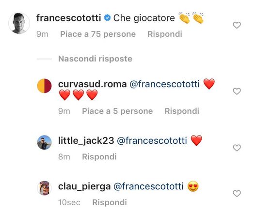 COMPAGNI - Immediate sono arrivate le risposte di alcuni giallorossi, come Lorenzo Pellegrini, che ha commentato con un cuore il messaggio di Aquilani, come Mimmo Criscito. Spazio anche ad Alvaro Morata,"Complimenti per la tua carriera"; "Un esempio", scrive invece Sergi Semper. "Grande sghi!! Giocatore toppppp e adesso viene il bello!! Goditela!!", il messaggio di Luca Toni. Non poteva mancare poi il commento di Francesco Totti: "Che giocatore". Con tanto di applausi.