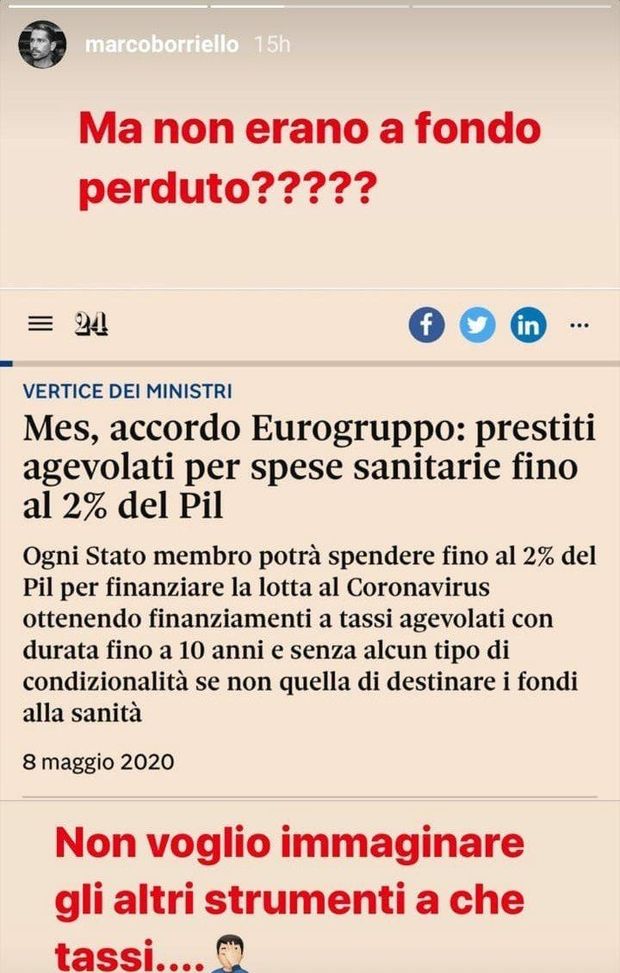 Dal campo alla politica il passo è breve. Lo sa bene Marco Borriello, che in questo momento di grande difficoltà per il Paese ha deciso di buttarsi sui social a commentare quando sta accadendo nel panorama politico italiano. Uno degli argomenti su cui l'ex Roma ha dimostrato di essere più sul pezzo è stato l'economia e in particolare il discusso Mes. "Ma non erano a fondo perduto? Non voglio immaginare gli altri strumenti e a che tassi...", questo il commento scettico su Instagram del calciatore, che poi ha voluto offrire un appoggio incondizionato al sindaco di Milano Giuseppe Sala. "Mi chiedo perché gente come te non sia a Roma a portare avanti questo paese", ha sostenuto Borriello, "Una persona di cultura, con un percorso professionale di un certo livello e con gli attributi".