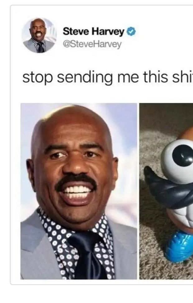 IL CASO HARVEY - Il 20 luglio 2018 sul portale Imgur un utente pubblicò un fotomontaggio di un tweet del noto conduttore televisivo Steve Harvey che chiedeva appunto ai fan di "Smetterla di inviarmi questa m***a". Il tutto corredato da una foto di Harvey a confronto con Mr Potato. Il post e la somiglianza diventarono virali, raggiungendo un numero di commenti e condivisioni tale da creare il classico meccanismo social del meme. Non a caso iniziarono subito a spuntare dei post simili, con altre celebrità prese di mira in maniera più o meno bonaria da i vari internauti di turno. Il wide receiver dei New Orleans Saints Michael Thomas, la stella pop Miley Cyrus, la first lady Melania Trump e altri volti noti del contesto americano tutti coinvolti nel gioco virtuale.