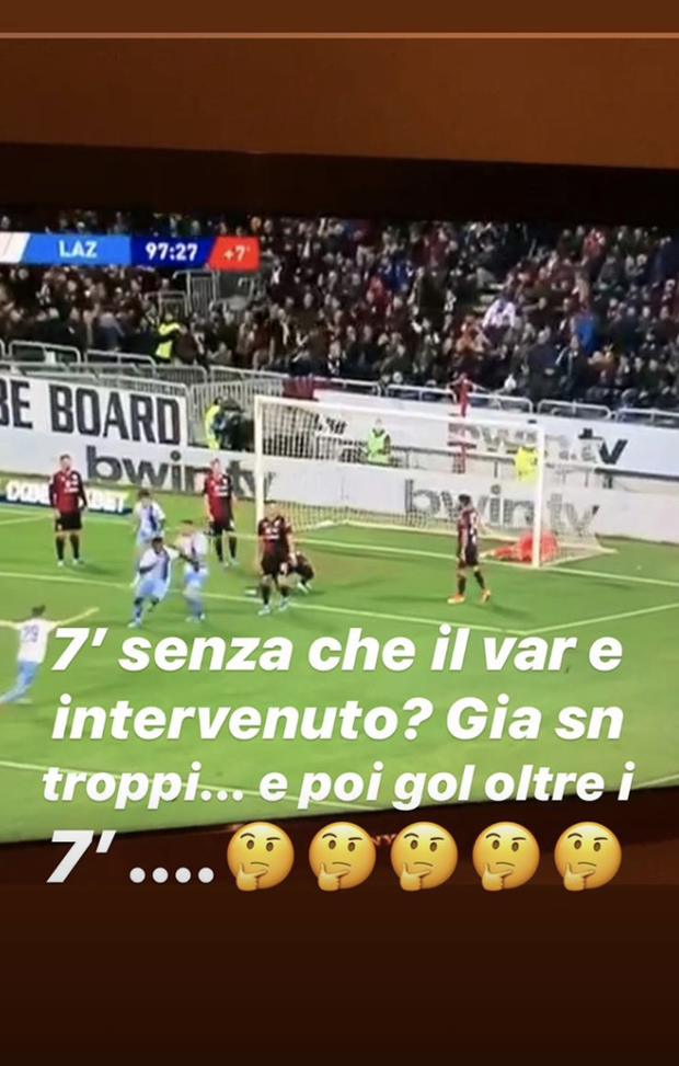 Non si spengono le polemiche su Cagliari-Lazio. La squadra di Simone Inzaghi ha vinto al 98° con un gol di Caicedo: Radja Nainggolan è andato su tutte le furie. Tramite una storia pubblicata sul suo profilo Instagram, l'ex centrocampista di Inter e Roma ha affermato che il gol decisivo dei biancocelesti sia arrivato oltre i sette minuti di recupero: "7' senza che il Var è intervenuto? Già sono troppi e poi gol oltre i 7' ". Con questa vittoria la Lazio consolida il terzo posto, mentre il Cagliari fallisce il sorpasso sulla Roma che rimane al quarto posto in solitaria.