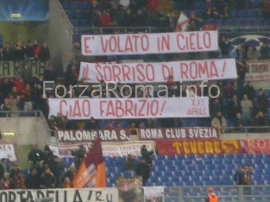 Intutto lo stadio striscioni in sua memoria e la Curva che, al momento dell’ingresso in campo delle squadre, si colora di bianco giallorosso. “Ciao Fabrizio”, “Fabrizio c’è” “Fermate Roma, saluta Mortadella” sono le scritte che compaioni in vari posti della curva, mentre in Tevere uno striscione recita “E’ volato in cielo il sorriso di Roma. Ciao Fabrizio”. Poi il coro “Mortadella con noi!”. Sul tabellone luminoso è apparsa anche la foto di Eolo Capacci, il giornalista sportuvo romano scomparso domenica, il quale è stato omaggiato dal pubblico romanista con un applauso.