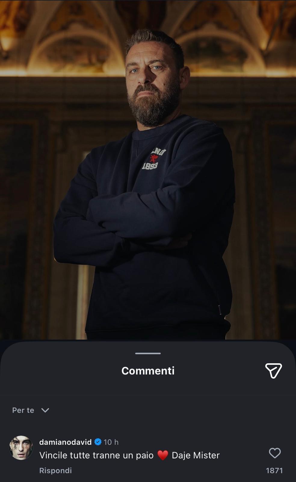Il legame tra Damiano David e la Roma è noto a tutti, e il cantante, grande tifoso giallorosso, lo ha dimostrato ancora una volta. Sui social, infatti, ha voluto salutare Daniele De Rossi, ex capitano e tecnico della Roma, che ha appena iniziato la sua nuova avventura alla guida del Genoa. “Vincile tutte tranne un paio. Daje Mister”, ha scritto Damiano in una storia su Instagram, scatenando la reazione entusiasta dei tifosi romanisti. Un messaggio ironico ma affettuoso, con cui il cantante ha voluto augurare il meglio a De Rossi, con un’unica eccezione: i due match contro il club giallorosso. Per l'ex tecnico capitolino si apre così una nuova sfida in Serie A, alla guida dei rossoblù, che debutteranno contro la Fiorentina. Per vederlo nuovamente in panchina, tuttavia, bisognerà attendere il prossimo turno, visto che deve scontare ancora un turno di squalifica.