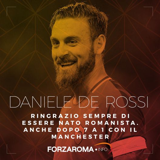 Trentuno ottobre 2017, anno 1 dopo Totti. De Rossi non è più 'Futuro', è il capitano indiscusso della Roma. Con la maglia giallorossa in tutti questi anni ha vissuto gioie e dolori, sicuramente molte delusioni. In primis non essere riuscito (per ora) a vincere uno scudetto con questo club. Rimpianti, ma anche la voglia di provare ancora a lottare per un trofeo. Così dopo la vittoria per 3 a 0 contro il Chelsea, nella sua 50esima presenza in ChampionsLeague, ecco tornare la speranza e quel senso di appartenenza ai colori giallorossi che lo ha sempre contraddistinto: “Mi ricordo la vittoria contro il Chelsea di dieci anni fa e una vittoria così rimane nella testa, ma noi non giochiamo per farci le foto da mettere nel comodino. Non dobbiamo perdere la trebisonda, la Champions forse è un pochino sopra le nostre possibilità, però, dopo serate del genere chissà. Io comunque ringrazio sempre di essere nato romanista, anche dopo il 7-1 contro il Manchester”.