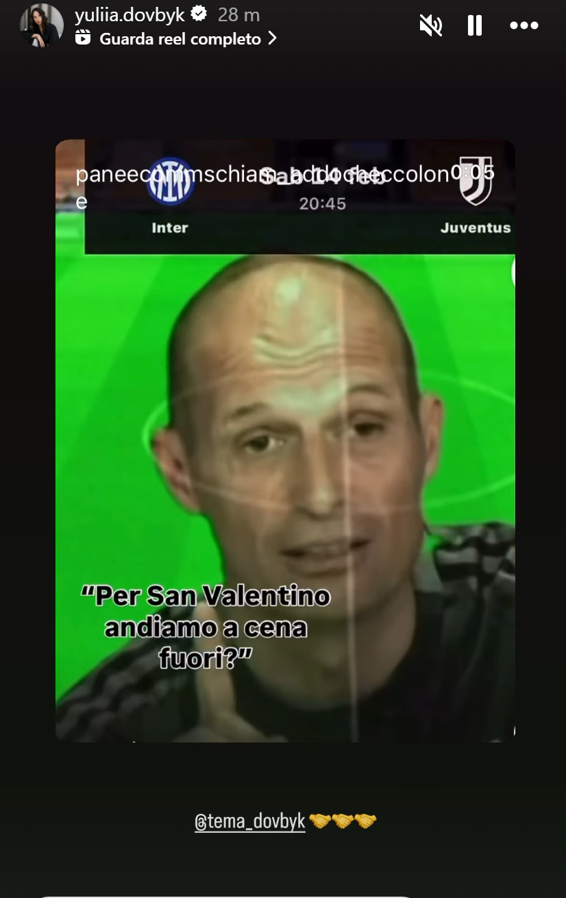 Si avvicina il 14 febbraio, che per gli innamorati vuol dire solo una cosa: San Valentino. Le coppie in occasione della ricorrenza che celebra il loro amore sono solite andare a cena fuori, farsi regali e passare un amorevole serata insieme. Quest'anno, però, sabato 14 febbraio cade di sabato e, guardando al programma della venticinquesima giornata di Serie A, alle 20.45 è stato fissato il Derby d'ItaliaInter-Juventus. Un dilemma dunque coglie le coppie: partita o cena romantica? Yuliia, la moglie di Artem Dovbyk, non sembra avere dubbi. La consorte del centravanti della Roma attualmente ai box, infatti, ha condiviso un Reel su Instagram di un video di una vecchia conferenza stampa in cui Massimiliano Allegri, oggi tecnico del Milan, afferma "No, domani è impossibile". In sovrimpressione la domanda "Per San Valentino andiamo a cena fuori?" e la schermata della partita Juventus-Inter, oltre all'emoji della stretta di mano e il tag dell'account di Artem.