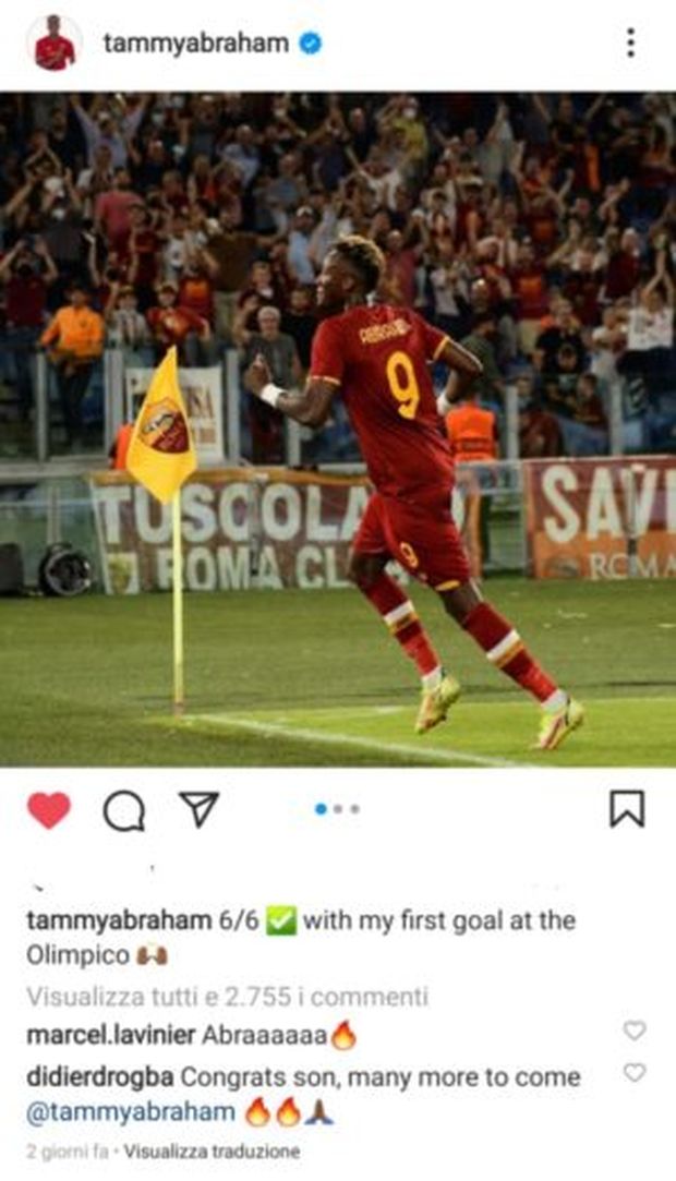 Abraham lo ha inserito nella lista dei 5 attaccanti che più preferisce nella storia del calcio: Drogba. L'apprezzamento sembra essere reciproco tanto che l'ex Chelsea ha commentato la foto pubblicata su Instagram dal giallorosso dopo il primo gol all'Olimpico: "Congratulazioni, ne arriveranno tanti altri", scrive l'ex giocatore. Queste le parole che l'inglese ha pronunciato ieri ai canali della Roma: "Penso che il mio primo ricordo di lui risalga a un giorno in cui ero in ritardo per l'allenamento. C'erano delle macchine davanti a me e non riuscivo a passare. Ricordo che mia madre stava urlando alla sicurezza di farmi passare, dicendo che ero in ritardo. Drogba ci stava superando con la sua auto e si è offerto di farmi salire con lui perché lui ovviamente aveva il pass per entrare direttamente quindi ha chiesto se volevo passare con lui. Nessuno dei compagni mi ha visto con lui...Ma posso comunque dire che Drogba mi ha accompagnato ad un allenamento! Avevo 7 o 8 anni. Speravo che in quel momento tutti i miei compagni fossero fuori e che mi vedessero insieme a lui. Ma non c'era nessuno. L'unico testimone era mia madre".