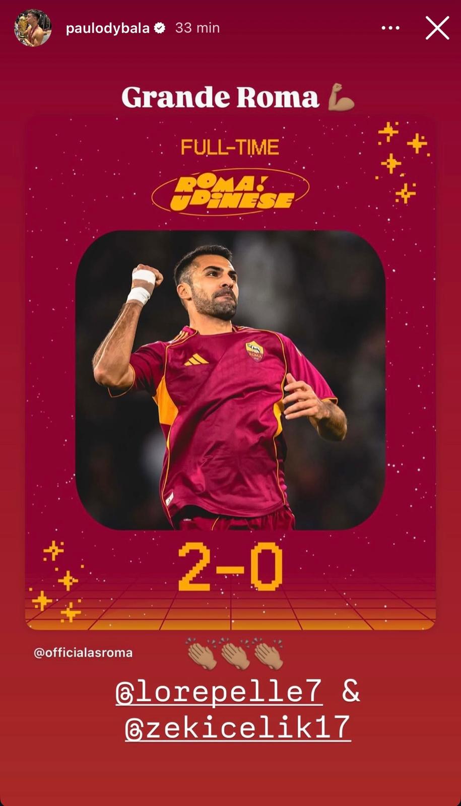 La Roma continua a volare in Serie A e, almeno per qualche ora, si gode il primato solitario. La vittoria per 2-0 contro l’Udinese conferma l’eccellente stato di forma dei giallorossi, che hanno conquistato 24 punti nelle prime 11 giornate. Anche chi non è sceso in campo resta vicino alla squadra, dimostrando un gruppo sempre più unito e compatto. È il caso di Dybala, che, nonostante l’assenza per infortunio, ha voluto far sentire la sua vicinanza tramite i social, pubblicando un messaggio semplice ma carico di entusiasmo: “Grande Roma”.