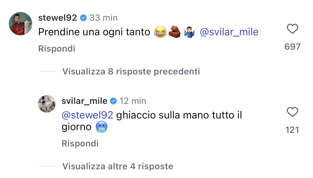 Che Mile Svilar sia il portiere più forte del nostro campionato lo sta dicendo il campo negli ultimi mesi. Quello dei vari stadi di Serie A, ma pure quello a Trigoria e a sbattere ancora contro il muro serbo è sstato stavolta Stephan El Shaarawy. In allenamento il Faraone stava per segnare un gran bel gol al volo da distanza molto ravvicinata col portiere. Ma il solito Svilar si è opposto al tiro, molto potente anche se un po' centrale, con una grande giocata di reattività e potenza. "Ma che sinistro c'hai?", gli dice Mile rialzandosi. Sui social è andato in scena poi il siparietto sotto al video pubblicato dalla Roma: "Prendine una ogni tanto", fa ElSha al compagno. Che ha negato la rete all'attaccante, pagandone comunque il prezzo: "Ghiaccio sulla mano tutto il giorno", risponde il portiere riferendosi alla potenza del tiro.