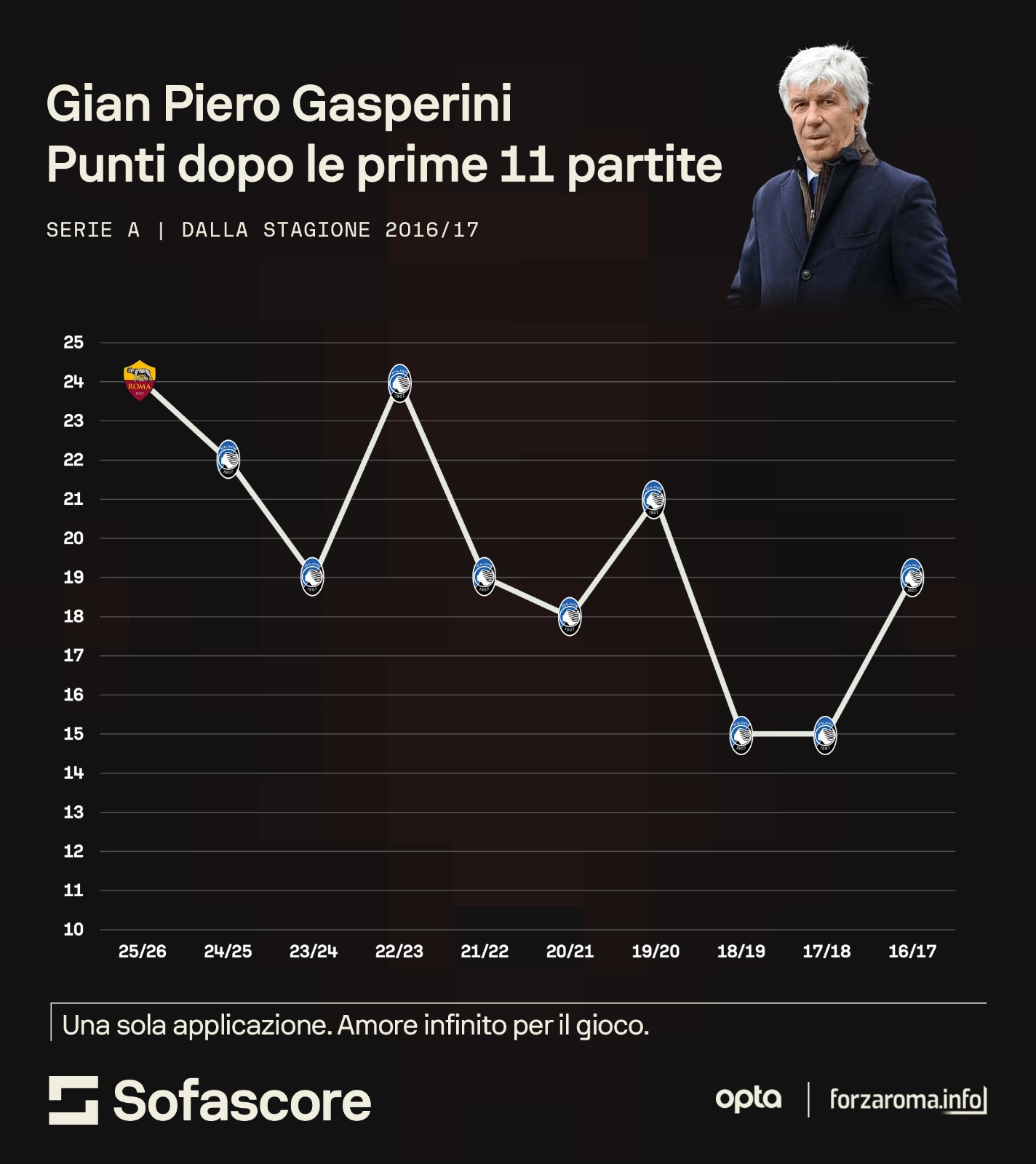 Ventiquattro punti in undici partite, con qualche rammarico per le sconfitte con le milanesi. La partenza della Roma di Gasperini è davvero tanta roba. Anche per il tecnico che solo una volta in carriera aveva ottenuto così tanto nelle prime undici giornate. Come riporta SofaScore l'unico precedente è datato 2022-2023 quando la sua Atalanta ottenne gli stessi punti di Pellegrini e compagni. Nelle altre annate la partenza era sempre stata più soft: 19 nel 2016, 15 nei due anni successivi, 21 nel 2019, 18 nel 2020, 19 nel 2021 così come nel 2023 e 22 lo scorso anno. E in quasi tutte le recenti stagioni Gasp ha centrato la zona Champions. Se il buongiorno si vede dal mattino...
