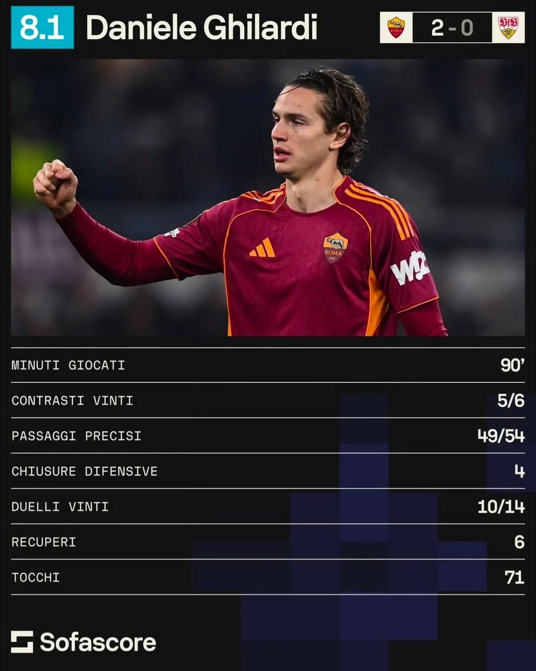 —Il lavoro di Gasperini, che ha a lungo preservato e gestito il classe 2003, sta cominciando a dare i suoi frutti. Ghilardi, ieri, è stato leader sia in termini di chiusure e interventi decisivi che di personalità. Una percentuale quasi totale di contrasti vinti (5/6) che si affianca ai tanti duelli vinti (10/14) e ai recuperi (6) in ogni zona del campo, dati di Sofascore. Il difensore giallorosso è stato una spina nel fianco dello Stoccarda, bloccando azioni d'attacco che stavano diventando pericolose (4 chiusure difensive), ma anche disturbando il gioco dei tedeschi con recuperi alti. Ma non finisce qui. Da buon braccetto, Ghilardi è stato anche capace di interpretare al meglio il ruolo di costruttore della manovra, da cui spesso passano i primi palloni di un'azione. Non a caso è il giallorosso con più tocchi (71) in assoluto: i compagni lo cercano ripetutamente e lui è bravo a prendersi la responsabilità di entrare nel pieno del gioco. Il tutto condito da una precisione notevole nei passaggi (49/54) che hanno consentito alla Roma di non perdere palloni sanguinosi. Una partita praticamente perfetta che testimonia il momento di crescita che il ragazzo sta attraversando.