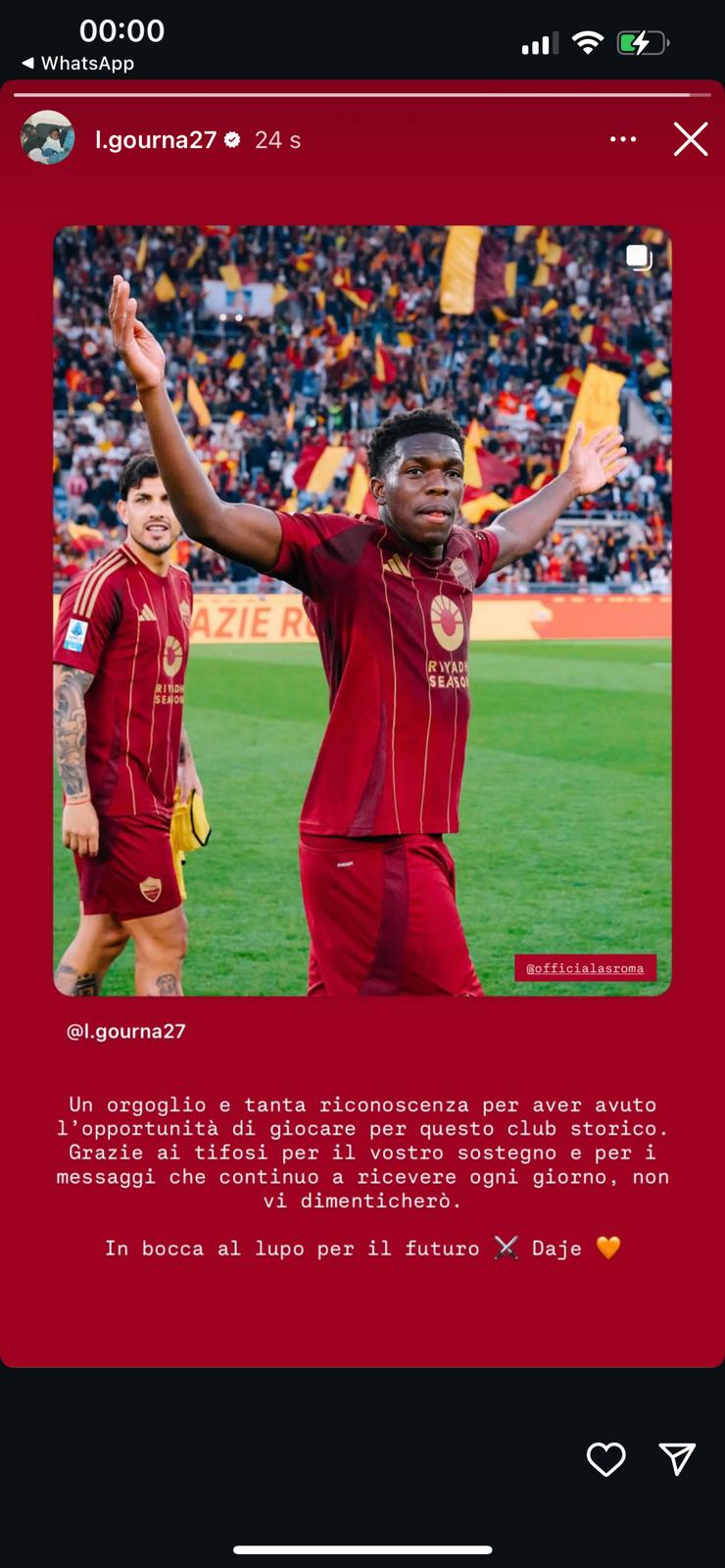 Lucas Gourna Douath saluta la Roma un po' a sorpresa dopo alcuni mesi dal mancato riscatto. Il francese era arrivato a gennaio scorso in prestito ma dopo 6 mesi i giallorossi hanno deciso di puntare su altri profili. Il classe 2003 stasera ha postato sul suo profilo Instagram una foto con i colori giallorossi e un messaggio di addio: "Un orgoglio e tanta riconoscenza per aver avuto l'opportunità di giocare per questo club storico. Grazie ai tifosi per il vostro sostegno e per i messaggi che continuo a ricevere ogni giorno, non vi dimenticherò. In bocca al lupo per il futuro. Daje!".