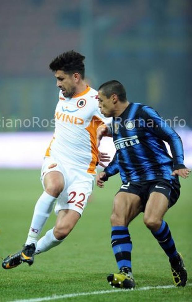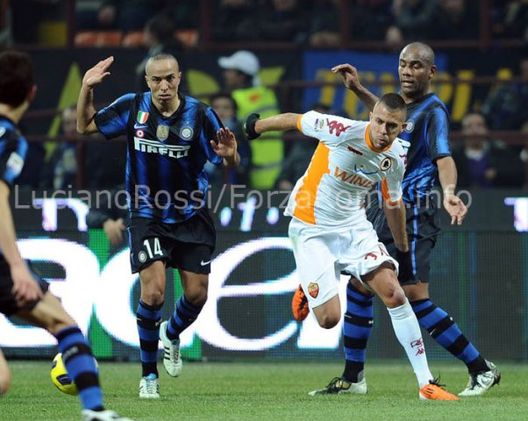 SECONDO TEMPO Squadre invariate nella ripresa, si riparte con il vantaggio nerazzurro. Subito prova la Roma con Riise: il sisnistro del norvegese non impensierisce Julio Cesar. La trama è quella del primo tempo con ritmi alti e squadre che provano a giocarsela. Interessante la punizione per la Roma al 50': il tiro di Vucinic è però inguardabile... E' sempre Menez il più arretrato degli attaccanti, mentre i centrocampisti, tolto Simplicio, accompagnano poco la manovra offensiva preoccupandosi soprattutto della fase di copertura. L'Inter tiene bene la palla, Thiago Motta e Kharja fanno possesso, mandando a vuoto il pressing romanista, certamente non "forsennato"... Azione insistita al 57' dei tre attaccanti giallorossi: dopo un batti e ribatti è De Rossi a provare la conclusione da fuori senza però impensierire il portiere nerazzurro. Rigore per l'Inter al 61' ed espulsione di Burdisso: l'argentino ferma in area Pazzini e dagli undici metri Eto'o trasforma. Al 63' c'è il primo cambio: Loria in campo per Menez, l'ex atalantino potrebbe fare coppia con Juan anche nella gara di sabato contro il Napoli. Al 66' Perrotta lascia il posto a Taddei, la Roma appare estremamente demoralizzata. Miracolo di Julio Sergio su Pazzini al 68': contropiede nerazzuro a tre tocchi ma la risposta del portiere brasiliano è di ottimo livello. Al 70' entra Milito al posto di Pazzini, per la Roma il cambio è Greco per Simplicio. Capitola la Roma al 70': cross di Snejder, Eto'o fa la sponda di testa e Thiago Motta, praticamente dentro la porta, insacca indisturbato. Continua l'arrembaggio nerazzurro, con Julio Sergio che salva su Milito alla disperata. La Roma deve stare molto attenta, l'Inter non ha nessuna intenzione di fermarsi, vista la serata è meglio chiudere con un briciolo di dignità Entra anche Nagatomo, con Snejder che si becca la standing ovation del Meazza. Al 74' lampo di Vucinic: il montenegrino raccoglie un calcio di punizione sbilenco di De Rossi e mette alle spalle di Julio Cesar. I nerazzurri continuano a spingere, l'inferiorità numerica non aiuta i giallorossi a trovare un equilibrio ed una serenità che possano permettere di non soccombere agli attacchi interisti. Un lume di speranza per la Roma è dato dal gol di Loria: da calcio d'angolo Juan coglie il palo ed il difensore neo-entrato raccoglie e segna a porta vuota. E' 4-3 e si moltiplicano i rimpianti per un secondo tempo praticamente buttato. Ammonito De Rossi all' 87' per fallo su Javier Zanetti. Dopo aver fallito un'incredibile occasione con Milito a porta vuota, Cambiasso sigla il 5-3 dopo l'ennesima occasione in contropiede. La Roma si ritrova fuori dalla zona Champions pur avendo una partita in meno e sabato prossimo all'Olimpico c'è il lanciatissimo Napoli.