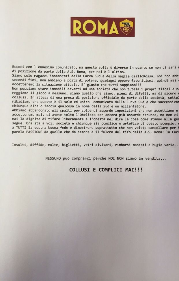 Abbiamo abbandonato gli spalti per colpa di assurde imposizioni che non accettiamo e non accetteremo mai, ci avete tolto l’Obelisco con ancora più assurde denunce, ma non ci toglierete mai la dignità di tifare liberamente e l'onestà nel dire le cose come stanno alla gente che ci segue. Ora sta voi, società e chiunque sia complice o artefice di questo scempio, dimostrare a TUTTI la vostra buona fede e dimostrare soprattutto che non volete cancellare per SEMPRE la parola PASSIONE da quello che da sempre è il fulcro del tifo della A.S. Roma: la Curva Sud.