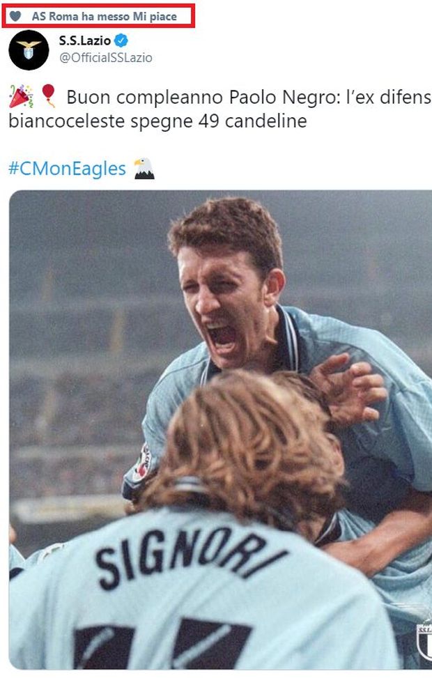 Nella storia lunga e decennale dei derby tra Lazio e Roma, c'è un momento impresso nella memoria dei tifosi giallorossi e risale all'autogol di Paolo Negro, il 17 dicembre 2000. Una data ricordata e celebrata quasi come una ricorrenza, al pari del compleanno dell'ex difensore biancoceleste. Ovvero il 16 aprile: proprio oggi la Lazio ha twittato un messaggio di auguri a Negro, a cui sono seguiti tanti commenti. Peccato che praticamente tutti siano di marca romanista. A questo si è aggiunto anche il 'like' dell'AS Roma, che quindi si è unita agli auguri. Anche lo scorso anno il club giallorosso aveva ritwittato il post della Lazio con una gif di Star Wars che ha divertito e non poco il web.