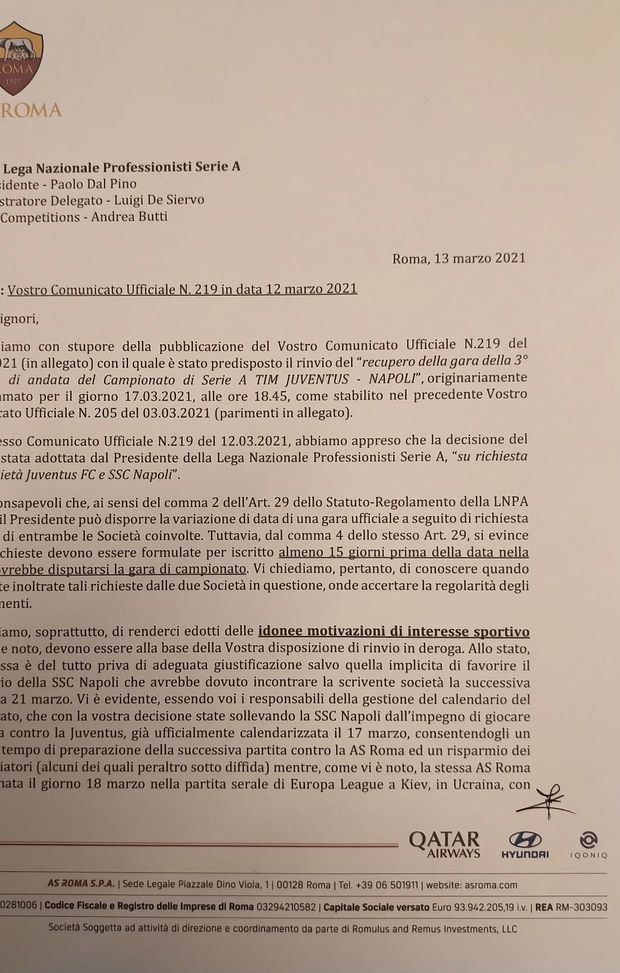 Confidiamo, dunque, nella Vostra comprensione e nell’urgente adozione, da parte Vostra, dei più opportuni provvedimenti correttivi. In caso contrario, ci riserviamo ogni azione a tutela della scrivente Società e degli Azionisti e dei nostri Tifosi, nelle sedi e giurisdizioni che si renderanno più opportune. In via subordinata, stante la prossimità con la gara di ritorno degli ottavi di finale di Europa League Shakhtar Donetsk-Roma, che si terrà in data 18 marzo 2021 alle ore 18.55, formuliamo sin d’ora formale richiesta di posticipazione, a data da destinarsi, della gara della 28a giornata del Campionato di Serie A TIM Roma-Napoli, attualmente in programma per il giorno 21 marzo 2021, ore 20.45”.