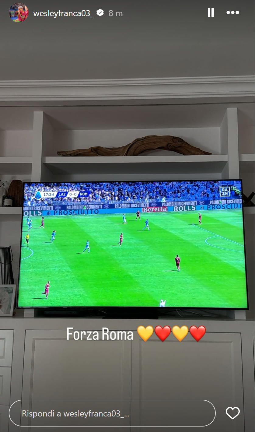 E' il giorno del derby della Capitale, il giorno della sentitissima sfida tra Lazio e Roma. Tra gli assenti in casa giallorossa, oltre a Dybala e Bailey che si sono recati all'Olimpico con la squadra, c'è anche Wesley, colpito nei giorni scorsi da un virus intestinale. Il brasiliano, sempre titolare e mai sostituito nelle prime tre gare di campionato, ha quindi dovuto dare forfait per il derby ma sta sostenendo i suoi compagni da casa. Wesley, infatti, ha condiviso una Story su Instagram in cui inquadra lo schermo del televisore e la didascalia "Forza Roma", accompagnata ovviamente da cuori gialli e rossi.