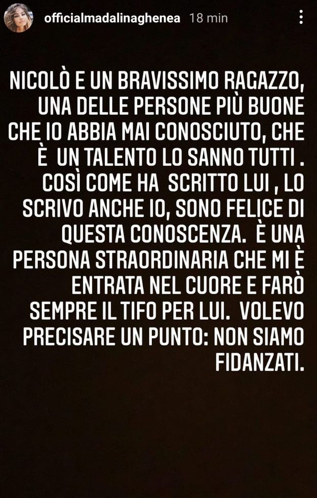"Nicolò è un bravissimo ragazzo, una delle persone più buone che io abbia mai conosciuto, che è un talento lo sanno tutti. Così come ha scritto lui, lo scrivo anche io, sono felice di questa conoscenza. E' una persona straordinaria che mi è entrata nel cuore e farò sempre il tifo per lui. Volevo precisare un punto: non siamo fidanzati".