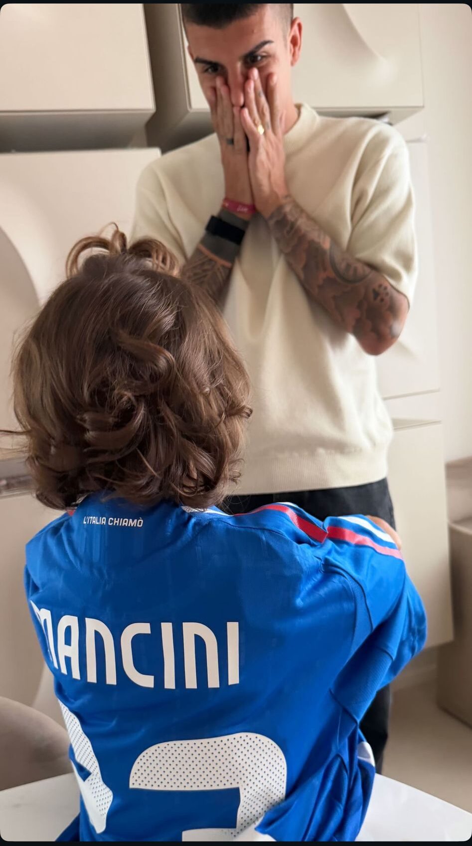È stata una serata speciale quella di ieri per Gianluca Mancini che ha realizzato la sua prima rete con la maglia della Nazionale. Il difensore giallorosso ha messo a segno la rete del 3-0 su Israele, chiudendo definitivamente la pratica. Dopo il gol Mancio ha ricevuto una dolcissima sorpresa a casa. La moglie Elisa ha infatti condiviso alcune storie su Instagram in cui si vede il difensore della Roma festeggiato dalle loro bambine, che gli hanno dedicato una torta con la scritta “Bravo babbo”. In un’altra foto, una delle figlie indossa orgogliosamente la maglia azzurra con il nome “Mancini” e il numero 23. Un momento tenero e familiare che ha conquistato i social.