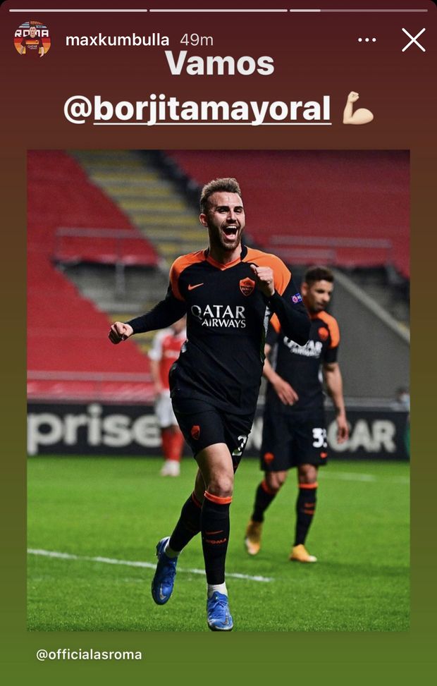 La Roma fa suo il primo round dell'andata dei sedicesimi di finale di Europa League contro il Braga, ipotecando il passaggio agli ottavi con un 2-0 fondamentale in trasferta. La squadra di Fonseca passa in Portogallo in totale emergenza difensiva visti gli infortuni di Cristante e Ibanez, ma i gol di Dzeko e Mayoral hanno messo in cassaforte il match. "Bella partita di tutta la squadra!!! Bravi ragazzi!!!", l'esultanza dello spagnolo entrato nel secondo tempo. È tornato invece al gol il bosniaco e Spinazzola, davanti a lui, 'alza le mani' come ha fatto capire nella sua story su Instagram. Durante la gara invece ha fatto il tifo da casa Marash Kumbulla, che ha incoraggiato la squadra a distanza e ha poi applaudito Dzeko e anche Borja Mayoral. E poi anche El Shaarawy ha celebrato il suo nuovo debutto con la maglia della Roma:"Si ritorna in campo con una grande vittoria. Bravi tutti!"