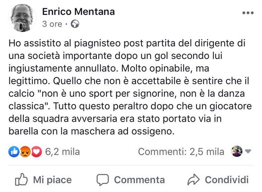 Poi aggiunge: "Ho assistito al piagnisteo post partita del dirigente di una società importante dopo un gol secondo lui ingiustamente annullato. Molto opinabile, ma legittimo"