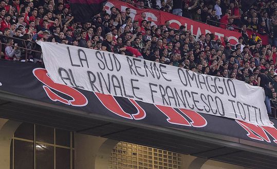 LO STRISCIONE DELLA SUD - Gli omaggi di San Siro per il campione diRoma non sono però finiti qui. All'inizio del secondo tempo la curva Sud rossonera ha esposto uno striscione con su scritto: "La Sud rende omaggio al rivale Francesco Totti". Lo striscione è rimasto esposto per ben 5 minuti, accompagnato da altri applausi.