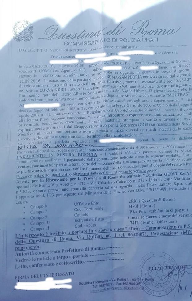 In Curva Nord “un tifoso è stato ripreso dalle telecamere dell'impianto sportivo mentre esponeva l'immagine nota dell'attore Alberto Sordi nei panni del Vigile Urbano" scrive la Questura nella multa pubblicata sull'account Facebook dell'avvocato Lorenzo Contucci. "Si giova precisare che la suddetta immagine veniva posta immediatamente dopo altro striscione con su scritto "MULTRAS".