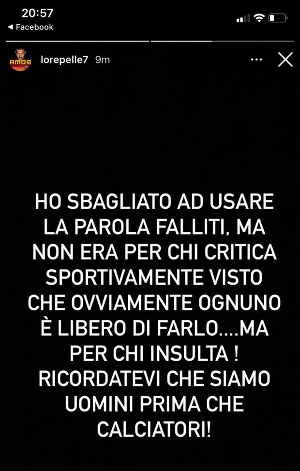 Il centrocampista poi, a freddo, ha corretto il tiro, specificando che il fosse rivolto esclusivamente a chi lo aveva insultato: "Ho sbagliato ad usare la parola 'falliti', ma non era per chi critica sportivamente visto che ovviamente ognuno è libero di farlo...ma per chi insulta! Ricordatevi che siamo uomini prima che calciatori", queste le sue parole in una nuova Storia Instagram.