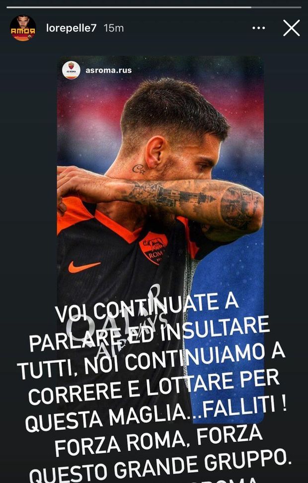 Lorenzo Pellegrini non ci sta. Il centrocampista della Roma poco dopo la fine della partita contro il Sassuolo ha postato una storia su Instagram in cui ha attaccato duramente chi ha criticato lui e la squadra nelle ultime ore e nell'ultima settimana: "Voi continuate a parlare ed insultare tutti, noi continuiamo a correre e lottare per questa maglia. Falliti. Forza Roma, forza questo grande gruppo".