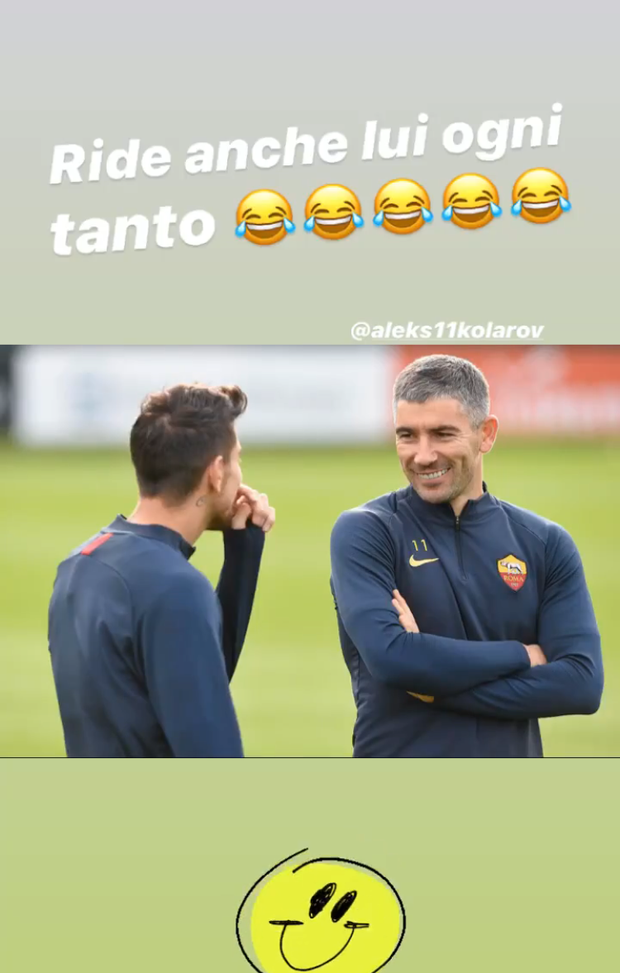 Si lavora e si suda tra le mura di Trigoria, ma a volte i calciatori si concedono anche qualche momento di relax. E Lorenzo Pellegrini ha voluto riportare su Instagram proprio uno di questi attimi, scherzando e ironizzando sulla serietà solita di Kolarov. Il centrocampista ha postato a proposito una foto di un ghigno divertito del serbo e un commento esilarante: "Ride anche lui ogni tanto". Dopo l'allenamento di oggi Pellegrini si è unito a Fonseca e agli altri rappresentanti della Roma per presenziare all'incontro tra allenatori, giocatori e arbitri che si è tenuto nella Capitale con gli alti vertici dell'AIA.