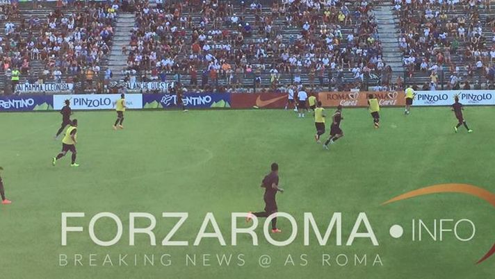 Ore 17.35 - La squadra si divide in due gruppi e inizia a riscaldarsi e a fare stretching. Gruppo 1: Totti, Di Livio, Destro, Gervinho, Cole, Mapou, Paredes e Maicon con Norman Gruppo 2: Castan, Vestenicky, Capradossi, D'Urso, Iturbe; Uçan, Strootman, Ndoj, Anocic, Falque, Sanabria, Calabresi e Machin con Lippie. Corsa sul posto e scatto.