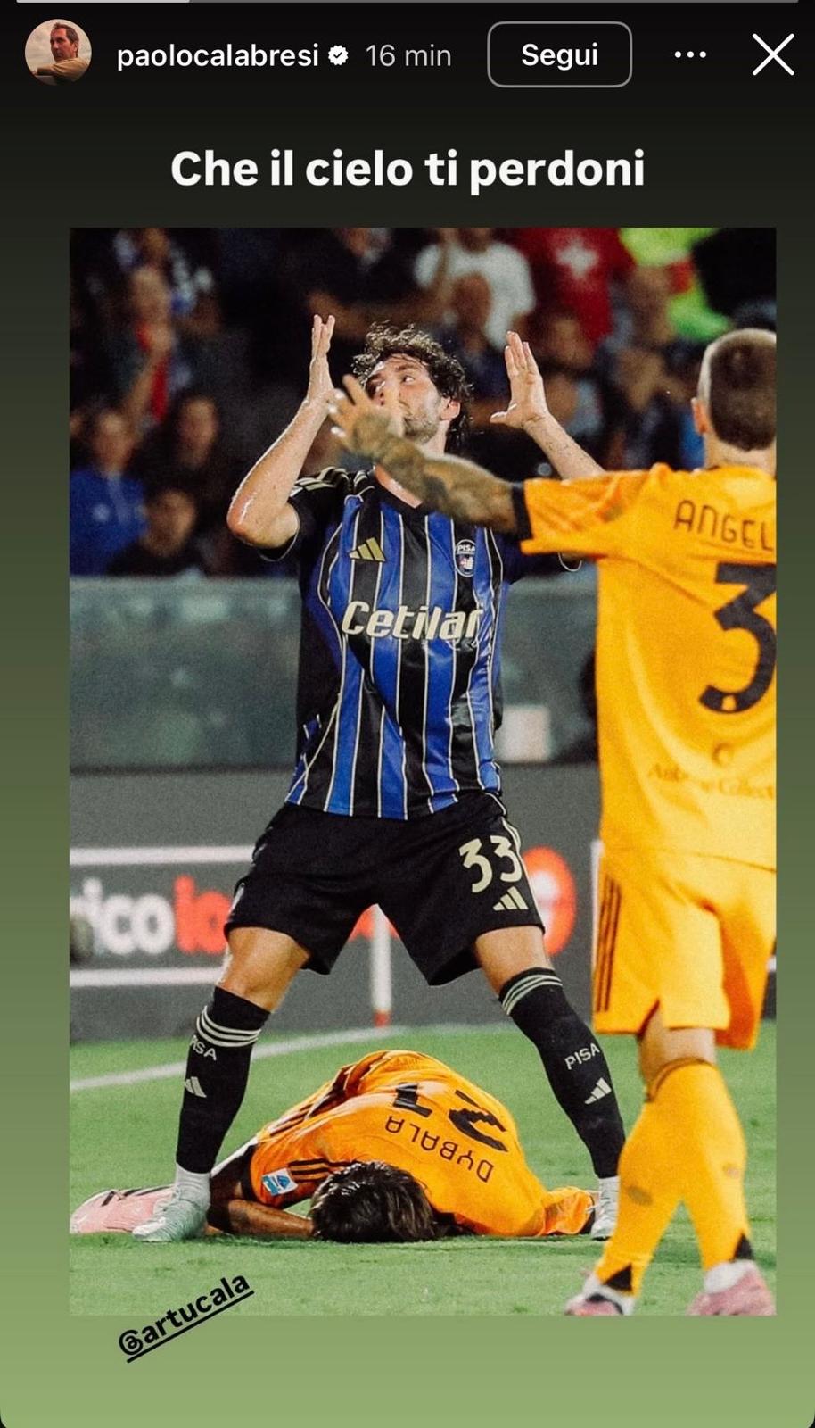 Ieri sera, durante la partita di Serie A tra Pisa e Roma, non sono mancati momenti di grande tensione in campo. Tra i protagonisti “fuori dal campo” c’è stato anche Paolo Calabresi, noto attore e tifoso romanista, che ha commentato con ironia un episodio che ha coinvolto suo figlio Arturo, difensore del Pisa. Nel corso del match, infatti, l’ex Lecce ha commesso un fallo su Dybala, e Calabresi non ha perso l’occasione per prenderlo bonariamente in giro. Su Instagram, l’attore ha pubblicato una storia con la scritta “Che il cielo ti perdoni”, sottolineando con umorismo il rischio di infortunare Dybala, noto per la sua fragilità fisica.