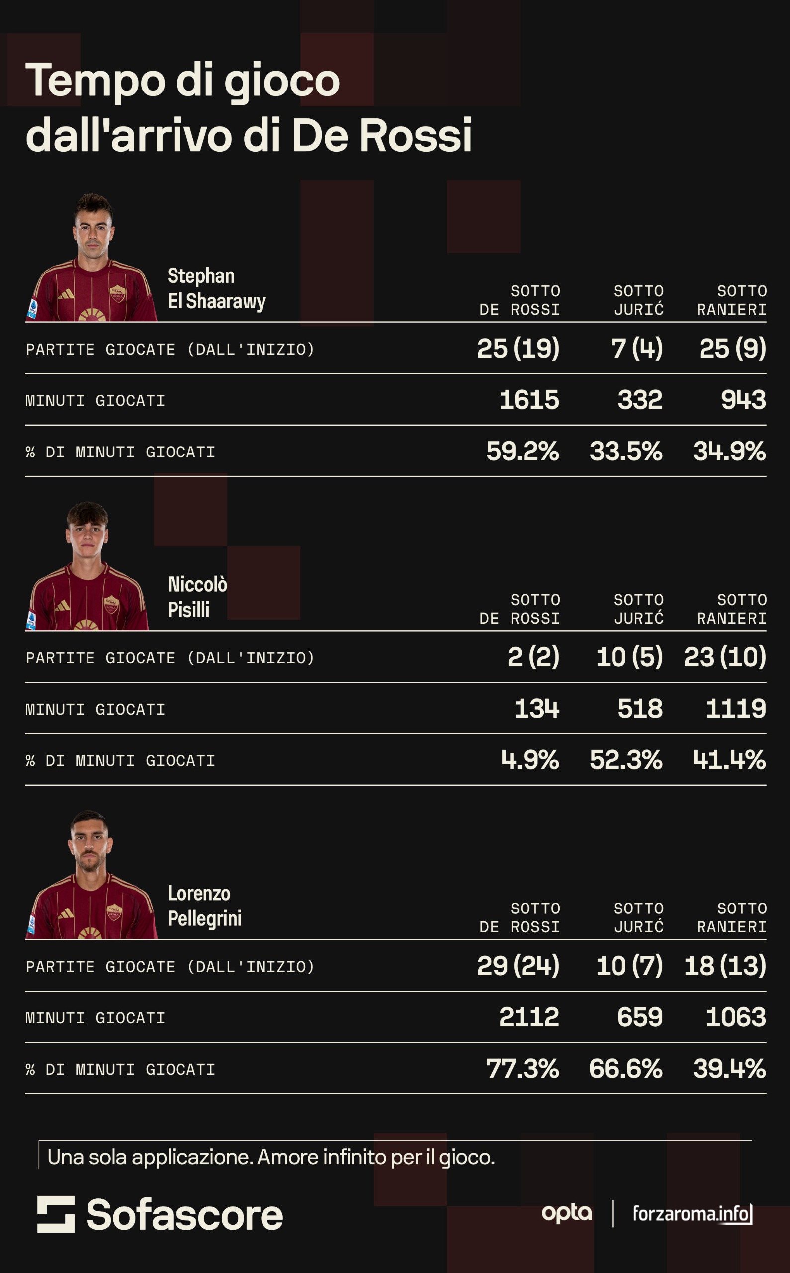 Lo spazio ridotto è dovuto poi anche al rientro di Bryan Cristante, che nel periodo di massimo impiego di Pisilli era infortunato. Ora il numero 4 è tornato stabilmente nelle rotazioni, spesso titolare, togliendo parecchi minuti al compagno più giovane. Fa parte della crescita. Però è in generale con Ranieri il prodotto del settore giovanile giallorosso ha trovato meno spazio, soprattutto rispetto a quanto ne ha avuto con Ivan Juric. Come testimoniano i numeri di 'Sofascore', con il croato 5 partite da titolare su 10 presenze e il 52,3% dei minuti in campo. Con sir Claudio questa stessa percentuale è scesa a 41,4% con 10 partite dal 1' sui 23 gettoni totali. E senza le coppe è probabile che da qui a fine stagione cali ancora. Sempre meglio di Pellegrini, che ha giocato più match da titolare (13) ma ha meno presenze totali sotto Ranieri (18) e meno minuti (1063 contro 1119). Si vedrà nel mercato estivo come cambierà la rosa della Roma, se i vari Cristante e Paredes faranno effettivamente le valigie e chi poi arriverà. Pisilli dovrà in qualche modo ripartire per dimostrare di meritare certe cifre e tornare a ritagliarsi un ruolo importante anche con il nuovo allenatore.
