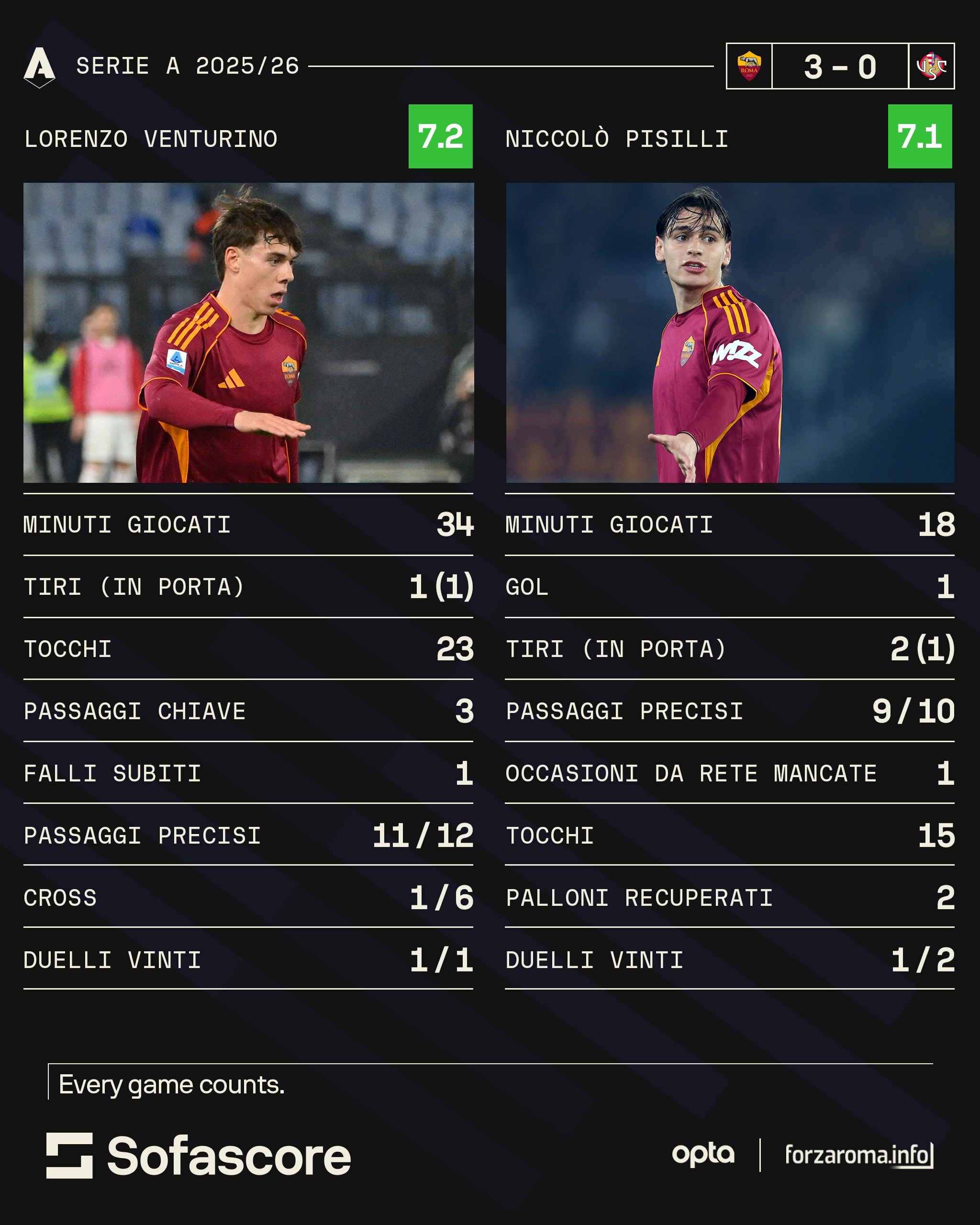 "Sti giovanotti de sta Roma bella". La Roma vola anche grazie ai suoi baby, da una parte Pisilli romano e romanista, dall'altra Venturino che è nato a Genova ma che si sta ambientando nella Capitale. Niccolò sta vivendo un sogno. Fino ad un mese fa l'addio non era da escludere (De Rossi lo voleva al Genoa) poi la doppietta allo Stoccarda ha cambiato tutto. "Non si muove", aveva detto Gasperini e così è stato. Si è ritagliato pian piano uno spazio importante nello scacchiera del tecnico e sia da subentrato che da titolare sta regalando prestazioni di alto livello. La svolta ad inizio anno con l'assenza di El Aynaoui causa Coppa d'Africa. Ha iniziato a giocare con continuità ma anche quando non il minutaggio era più basso non ha mai smesso di allenarsi al massimo. Un fatto messo in risalto anche da Gasp che col tempo lo ha premiato. Ora è il centrocampista giallorosso con più gol segnati (3) e su di lui ha messo gli occhi Gattuso che lo ha 'convocato' per la cena con gli azzurri di Roma e Lazio. Punta ad essere protagonista per i play off di marzo e poi sogna il Mondiale. Prima, però, c'è un pass da staccare. Pisilli in 18 minuti ha realizzato una rete, effettuato 9 passaggi precisi su 10 e ha recuperato due palloni (dati Sofascore)