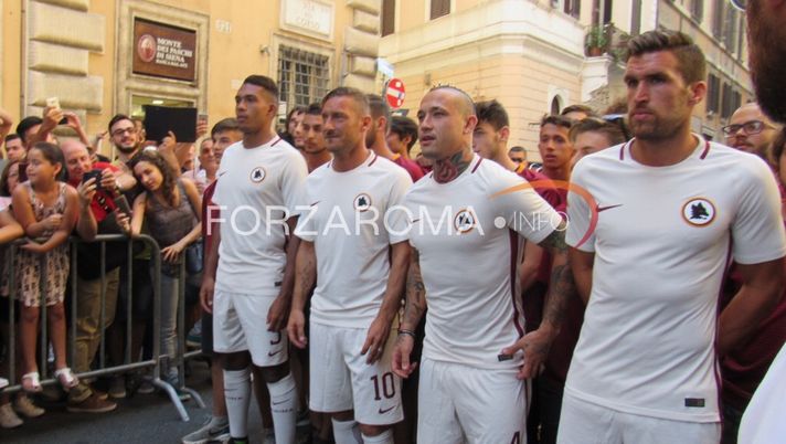 Ore 18.45 -Totti, Strootman, Nainggolan e Juan Jesus sfilano per via del Corso con le nuove maglie da trasferta.