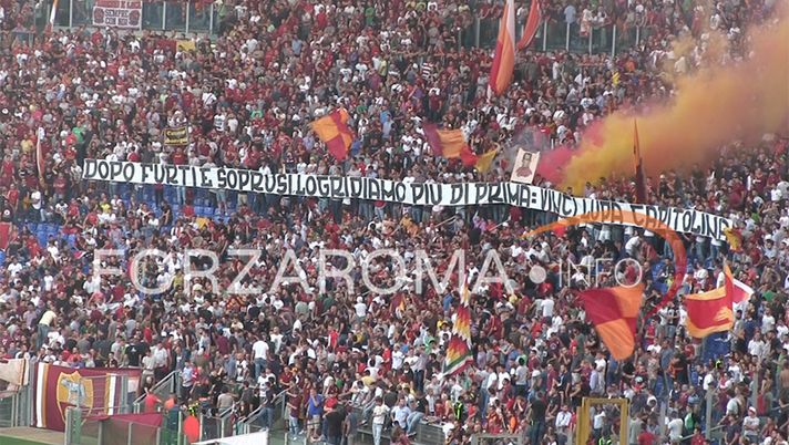 “Dopo furti e soprusi lo gridiamo più di prima: vinci Roma capitolina!”, lo striscione apparso in Curva Sud ad inizio match