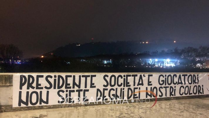 Continua a montare la rabbia dei tifosi romanisti. La squadra di Di Francesco sta deludendo per risultati ma soprattutto per la poca voglia e la scarsa determinazione mostrata in campo. Quella contro il Genoa, così, è già una partita decisiva per il futuro dell'allenatore e non solo: i sostenitori giallorossi si sono fatti sentire stanotte e lo faranno anche sugli spalti. A pochi minuti dal fischio d'inizio, inoltre, sul ponte Duca d'Aosta è stato esposto uno striscione che non risparmia nessuno: "Presidente, società e giocatori non siete degni dei nostri colori".