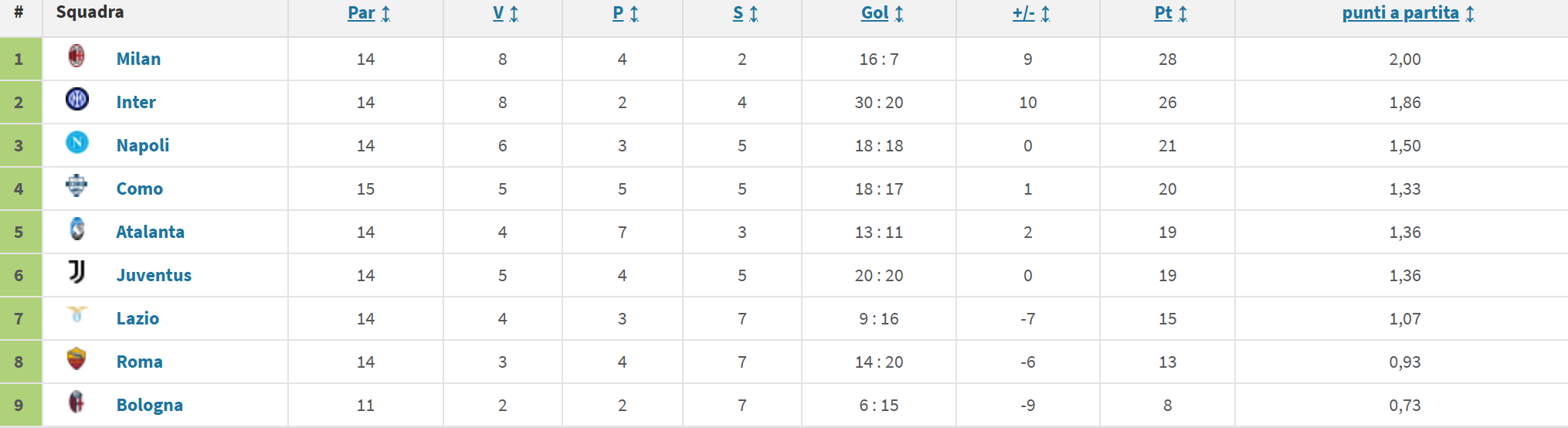 —Inserendo in questa speciale classifica anche gli incroci contro Lazio e Bologna (attualmente rispettivamente nona e ottava in classifica e attese avversarie della Roma nelle prossime settimane, con il derby alla penultima giornata e la trasferta in Emilia-Romagna in programma sabato prossimo), il rendimento cambia ma di poco. La squadra di Gasperini in 14 sfide ha raccolto 13 punti (considerando quindi le due vittorie contro biancocelesti e rossoblù nel girone d'andata), peggio ha fatto solo il Bologna di Italiano che in 11 gare disputate tra le prime 9 della classe ha raccolto 8 punti. I rossoblù però, a partire da stasera in casa della Juventus, da qui a fine campionato dovranno affrontare per la seconda volta in stagione proprio la Roma, il Napoli, l'Atalanta e l'Inter. Un miglior score considerando solo queste sfide ha avuto invece la Lazio, 15 punti in 14 gare dopo il 2-0 rifilato ieri al Napoli.