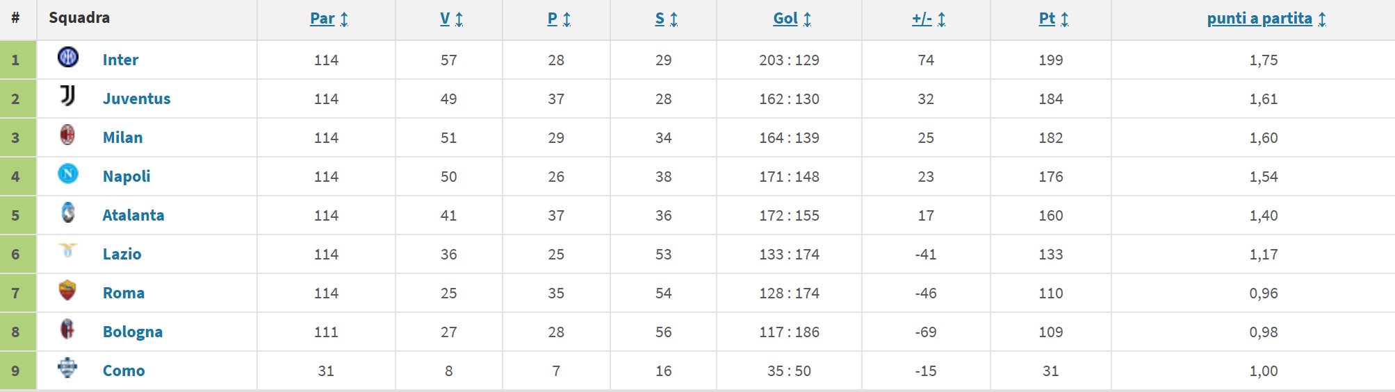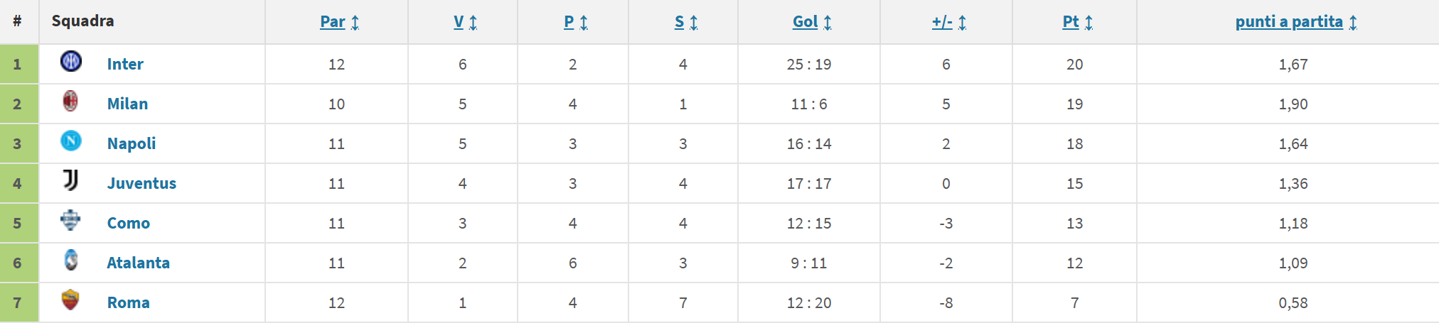 —Il dato non migliora affatto prendendo in considerazione il periodo che va dalla stagione 2018-19, la prima terminata fuori dalle prime 4 posizioni, ad oggi. Considerando in classifica anche il Como (che di scontri diretti ne ha giocati solo 31 a fronte dei 114 delle altre squadre e può essere considerata una vera "big" solo da questa stagione), la Roma ha conquistato solo 25 vittorie contro le grandi del campionato facendo registrare invece 35 pareggi e ben 54 sconfitte. La media punti è la peggiore tra tutte: solo 0.96 a partita, poco meno del Bologna (0.98) e meno anche dei lariani (1 punto a partita, considerando i 31 incontri disputati dal ritorno in Serie A). Di gran lunga meglio hanno fatto Lazio, Atalanta, Napoli, Milan, Juventus e Inter.