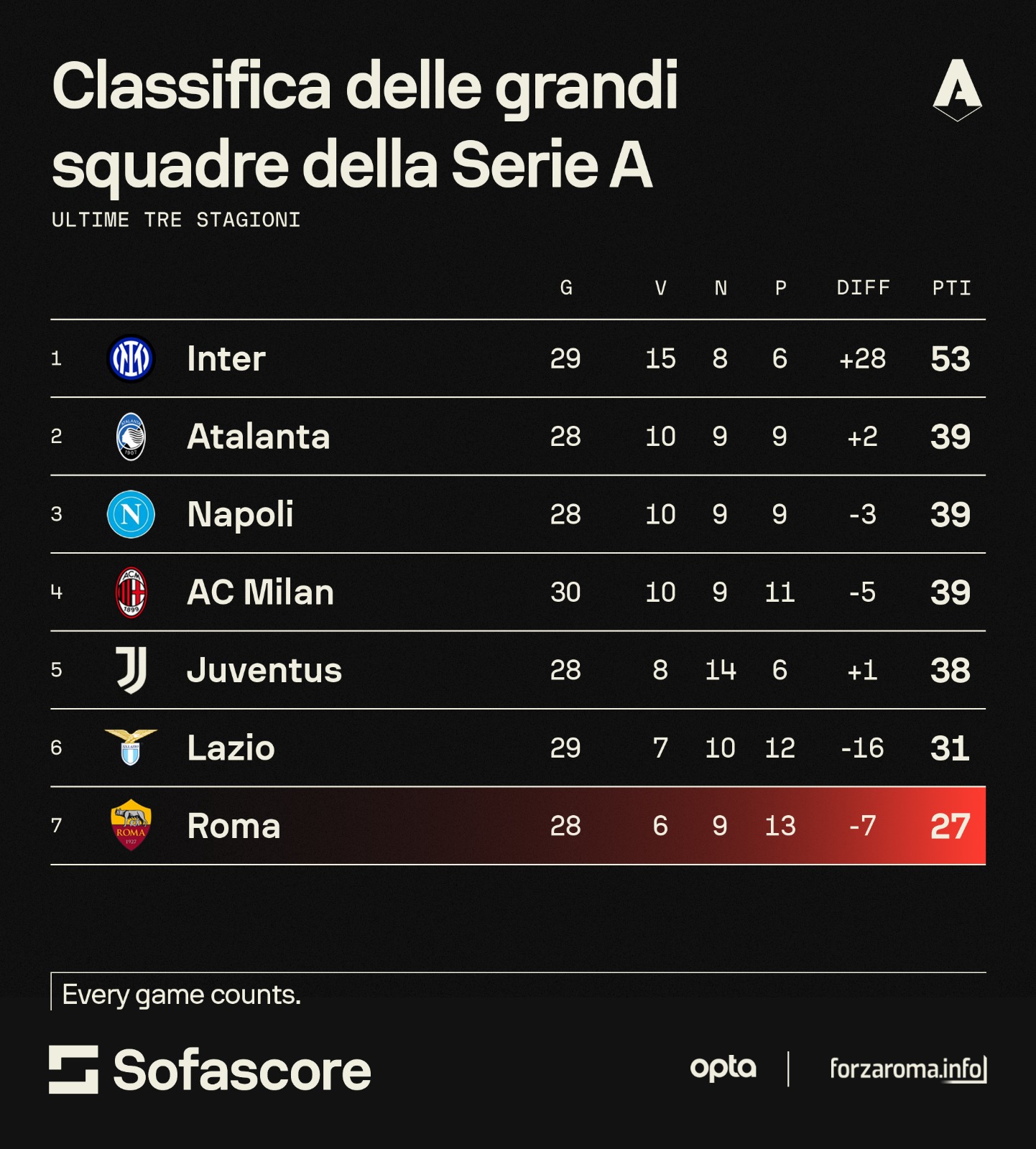 Al primo posto c'è l'Inter con 53 punti poi proprio l'Atalanta con 39, quasi tutti conquistati da Gasperini. Gli stessi di Napoli e Milan mentre al quinto posto c'è la Juve con 38. Un problema quindi che viene da lontano e che non sembra voler passare nemmeno quest'anno anche se va detto che la Roma ha se non altro tenuto testa a Inter e Milan nei precedenti scontri. Personalità? Differenza di valore? Forse entrambe ma di sicuro serve un'inversione di tendenza già a partire dal 20 dicembre quando la squadra di Gasp sarà ospite allo Juventus Stadium.