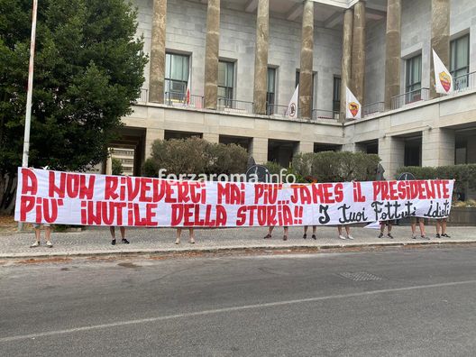 Sotto la sede amministrativa del Club sono stati esposti striscioni per il nuovo presidente e contro Pallotta