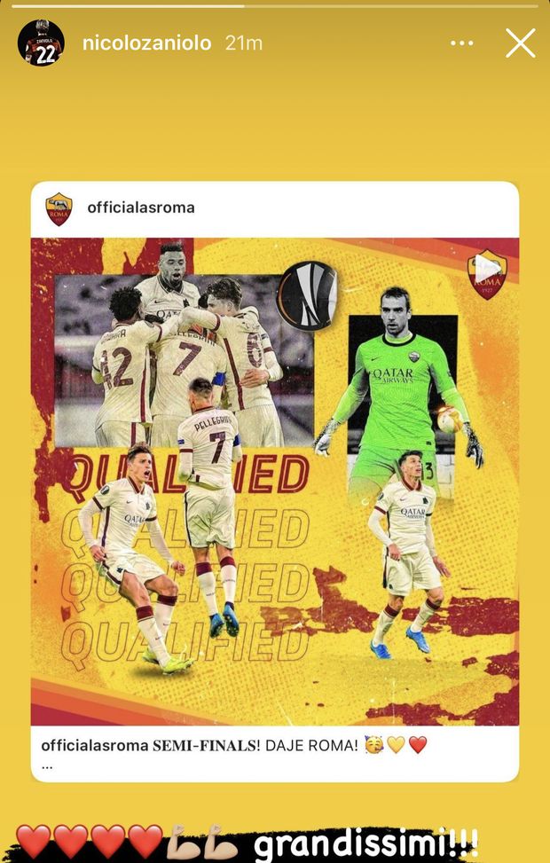 La Roma è in semifinale di Europa League. La squadra di Fonseca soffre, ma riesce a non capitolare e non perdere in due partite contro l'Ajax. I giallorossi festeggiano in campo, ma anche sui social. Il primo a gioire per la qualificazione dei suoi compagni è Nicolò Zaniolo, che su una story di Instagram scrive "Grandissimi". Tocca poi a Pau Lopez, che nel bene o nel male in questi quarti di finale ha lasciato una firma importante: "Bravi ragazzi! Semifinali, arriviamo", scrive il portiere spagnolo.