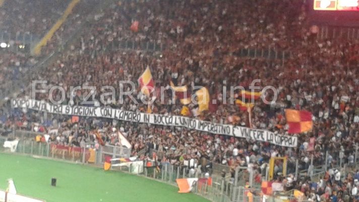 Striscione eloquente in Curva Sud "Dopo un'altra stagione con l'amaro in bocca, l'unico imperativo ? vincere la Coppa". Questa la scritta apparsa su uno striscione alzato al 10? del primo tempo.