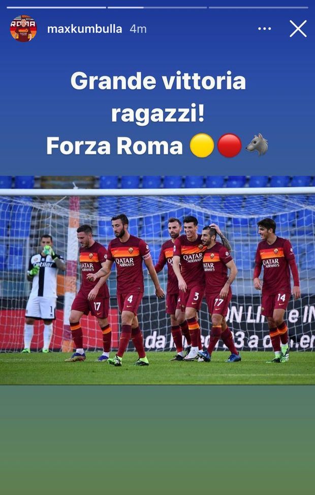 Continua il momento d'oro della Roma. I giallorossi non risentono delle gravi assenze, fra tutte quelle di Dzeko e Smalling, e hanno la meglio sul Parma con il risultato di 3-0. Fonseca può godersi così il secondo posto ad una sola lunghezza dalla sorpresa Sassuolo capolista, in attesa del posticipo serale tra due dirette concorrenti come Napoli e Milan. Ad aprire le danze sui social è un altro indisponibile di giornata, Marash Kumbulla che si complimenta con in suoi compagni di squadra attraverso il suo profilo Instagram: "Grande vittoria ragazzi. Forza Roma". A seguirlo è Zaniolo che, alle prese con la sua riabilitazione, fa sentire tutto il suo sostegno alla squadra: "Complimenti a tutti", con menzione speciale a Mkhitaryan, mattatore di giornata. Proprio l'armeno non perde l'occasione per dedicare la vittoria ai suoi connazionali, che aveva omaggiato anche durante la sua esultanza dopo uno dei due gol: "Per i nostri eroi armeni". Al termine del match si fa sentire anche Cristante, oggi centrale difensivo, che elogia la compattezza della sua Roma: "Gruppo. Squadra. Famiglia. Daje Roma, avanti così".