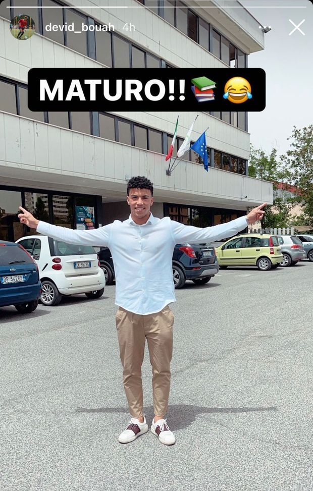 Devid Bouah consegue la maturità. Il terzino destro della Primavera, da ottobre in prestito in serie B al Cosenza, ha pubblicato su Instagram una storia che lo ritrae fuori dall'istituto in cui ha sostenuto gli esami finali. Le mani alzate, una camicia bianca, e la didascalia "Maturo!!", seguita dall'emoticon dei libri. Bouah rientrerà a Trigoria il 30 giugno, al termine del contratto con il club calabrese, con il quale ha collezionato 11 presenze in stagione. A fine maggio era stato inserito tra i convocati della Nazionale Under 20, anche se il giocatore non è riuscito ancora a trovare l'esordio in maglia azzurra. Il suo futuro sarà da valutare: Bouah potrebbe essere girato ancora in prestito, oppure compiere il salto in prima squadra, come riserva di Rick Karsdorp.