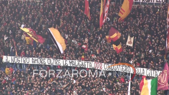 All'inizio della partita tra Roma e Sampdoria, posticipo della ventisettesima giornata di Serie A, la Curva Sud ha esposto uno striscione dedicato a Daniele De Rossi. Dopo la prestazione negativa nella gara di Europa League contro la Fiorentina in settimana si era scatenata una polemica intorno al numero 16, ma la parte calda del tifo della Roma ha subito mostrato la sua vicinanza nei confronti del ragazzo. Questo lo striscione:
