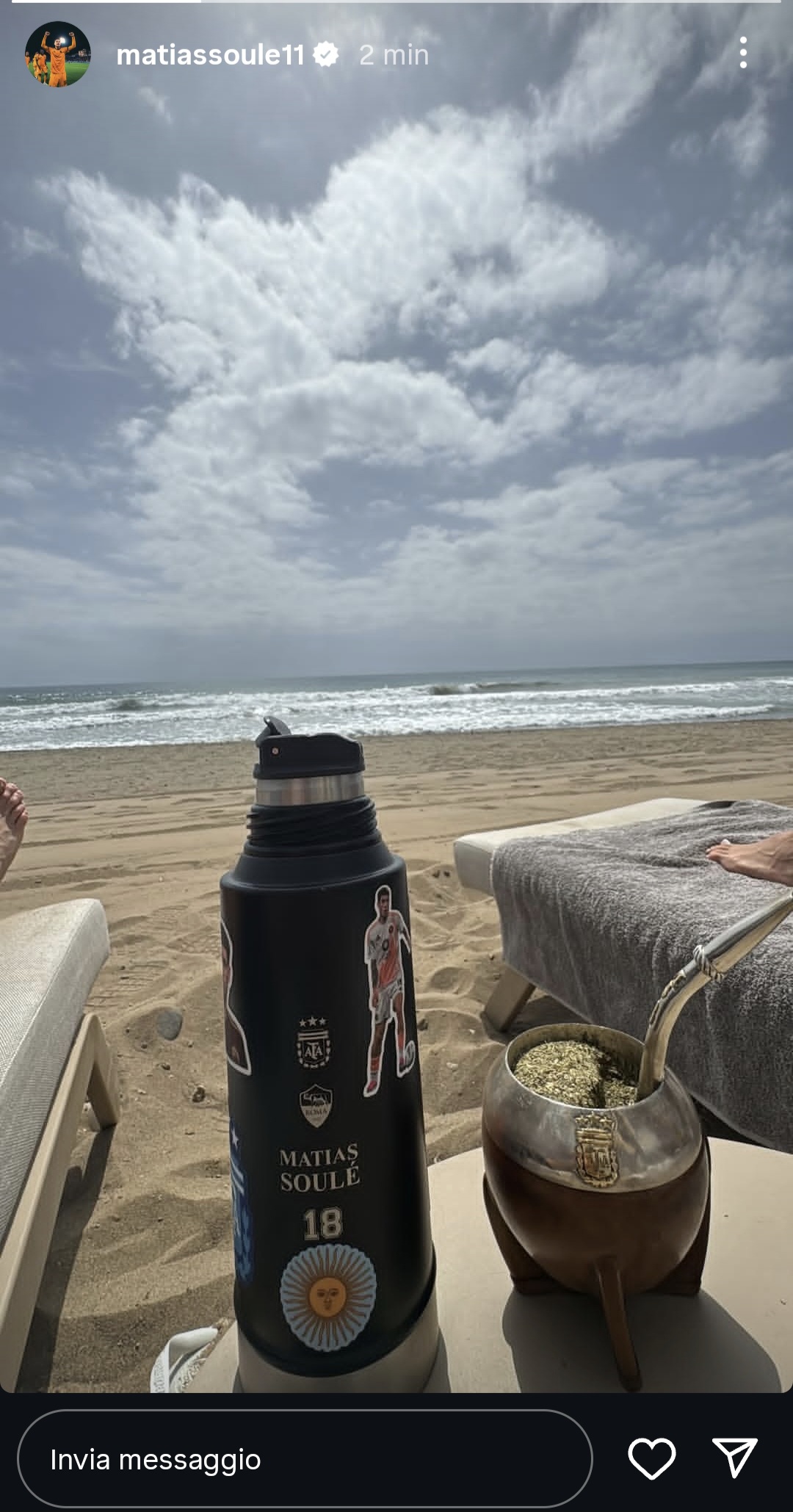 Sono ore di relax per i calciatori della Roma non impegnati con le rispettive Nazionali. Gian Piero Gasperini, infatti, ha concesso tre giorni di riposo ai suoi, con la ripresa fissata per martedì quando saranno tornati nella Capitale anche alcuni dei nazionali. Tra i giallorossi che si stanno godendo un po' di svago c'è anche Matias Soulé, protagonista dell'ultimo successo contro il Pisa arrivato proprio grazie a un suo gol. Oggi il fantasista argentino ha condiviso una foto del mare dove evidentemente sta ricaricando le pile e, in primo piano, il suo tanto amato mate, con la borraccia personalizzata dove sono ben in evidenza nome, numero di maglia (18) e gli stemmi di Roma e Argentina.