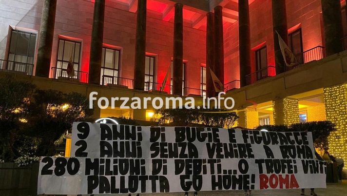 Continua la protesta dei tifosi della Roma contro James Pallotta e nuovi striscioni compaiono in città. Il primo viene affisso vicino l'ingresso della sede del club all'Eur in Viale Tolstoj. "Nove anni di bugie e figuracce. Due anni senza venire a Roma, 280 milioni di debiti...o trofei vinti. Pallotta go home" scrivono i tifosi giallorossi che a Trigoria ne appendono un altro che recita: "Nove anni di sole parole. Pallotta vattene". Infine uno all'ingresso dell'area di Tor di Valle, zona dove dovrebbe sorgere il futuro impianto capitolino. "Lo stadio dattelo in faccia" c'è scritto su quest'ultimo.