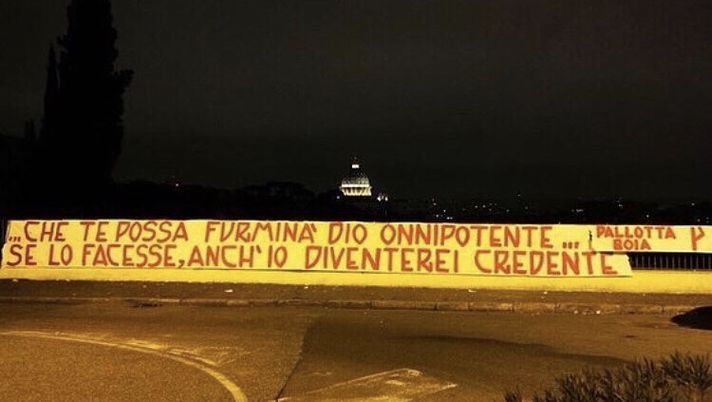 Nonostante la cessione della società sia alle porte, continuano le proteste dei tifosi contro la gestione Pallotta. Un gruppo di sostenitori giallorossi nella notte ha affisso in via Piccolomini uno striscione con un messaggio indirizzato all'attuale presidente della Roma: "Che ti possa fulminare Dio onnipotente. Se lo facesse, anche io diventerei credente". Una citazione tratta da "Versi pure, grazie" di Giancarlo Tramutoli. Nei giorni scorsi, oltre alla coreografia nel derby contro la Lazio che rappresentava lo stemma della Roma prima dell'era Pallotta, è stata lanciata anche una petizione online per riportare il vecchio simbolo sulle maglie dei giocatori.