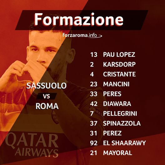 Questo l'undici giallorosso: Pau Lopez; Karsdorp, Cristante, Mancini; Bruno Peres, Pellegrini, Diawara, Spinazzola; Carles Perez, El Shaarawy; Mayoral.